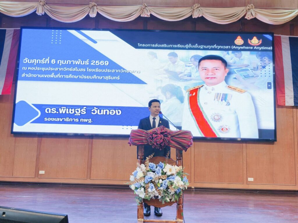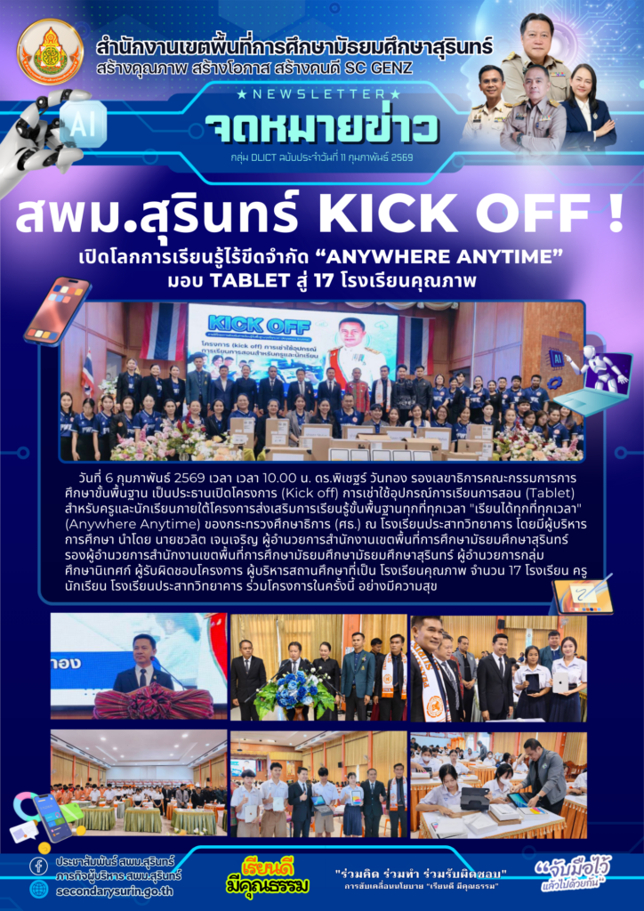 วันที่ 31 มกราคม 2569 สพม.สุรินทร์ เดินหน้าขยายผลการใช้งาน Saren Learning Space สู่การปฏิบัติจริงตามนโยบาย “เรียนได้ทุกที่ ทุกเวลา (Anywhere Anytime)” โดยนายชวลิต เจนเจริญ ผู้อำนวยการ สพม.สุรินทร์ มอบหมายให้ทีมวิทยากรผู้เชี่ยวชาญจากกลุ่ม DLICT ลงพื้นที่จัดอบรมเชิงปฏิบัติการพัฒนาทักษะดิจิทัล (Upskilling)